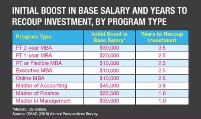 从财务方面来讲,机会成本和课程长度是影响投资收回时间长短的两大主要因素。比如,全日制2年的MBA校友通常付出的投资成本最多,因为他们不但要支付2年的学费,还要放弃整整2年的赚钱机会;而机会成本付出越少的毕业生越能够快速收回投资成本。