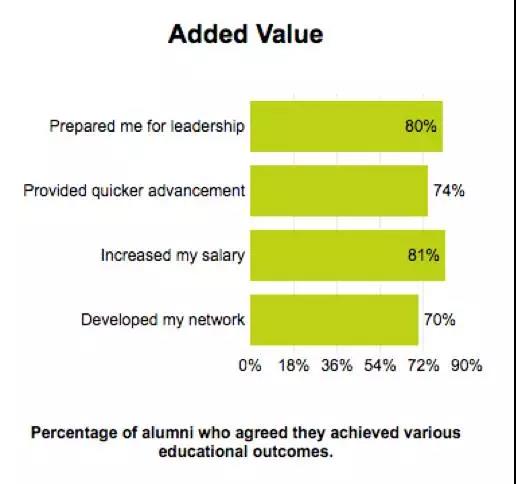 从非财务方面来讲,80%的校友认为读MBA为他们走上领导岗位做出了重要贡献,73%认为得益于读MBA的经历才获得了更快的职业晋升节奏,还有88%的校友同意读MBA充分开发了他们定性定量分析的能力以及各种软技能,目前大多数校友均对从事的工作表示满意。