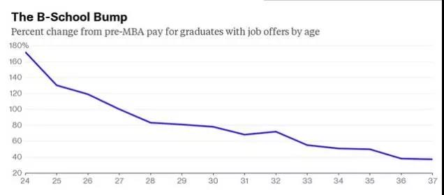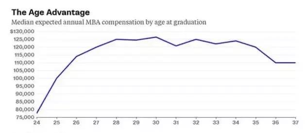 2014年调查了10000名全职MBA毕业生后发现,在30岁之前,得到MBA学位的年纪越大,薪水也就越高。这也能够解释的清楚:一个28岁的MBA毕业生比一个24岁的有更多经验和教育。令人惊奇的是,30岁之后,经验和教育带来的优势迅速下降。