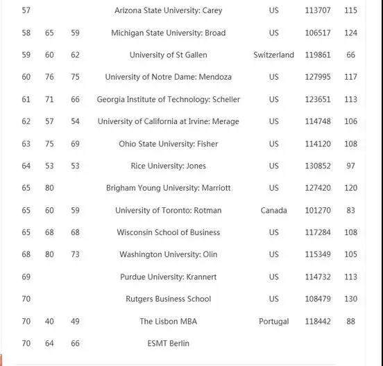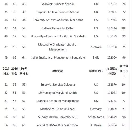 我们可以看到排名前十的商学院,毕业生薪水涨幅都在90%以上,事实上排名前100的商学院,最低的薪水涨幅也在60%以上,而最高的超过150%,有超过50家的毕业生薪水涨幅都超过100%。