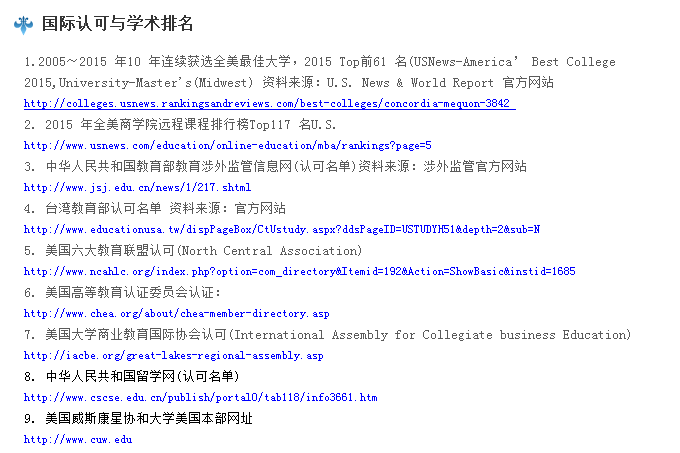 从上图中我们可以看出,商学院的认证,中国教育部承认这几项标准都是符合的。所以美国威斯康星协和大学的MBA项目是经过严格的商学院认证,同时也是获得国家认可的,也自然是受到企业的认可的。