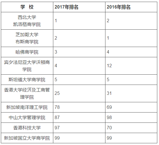 2017年MBA课程全球排名(部分)
