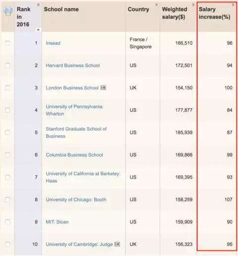 而最新数据显示,2011年至2016年间,在US News调查的全日制MBA毕业生中,其毕业起薪与红利从83280.51美元增长到了94048.24美元,增长了12.9%。而美国同期通胀率为6.7%。