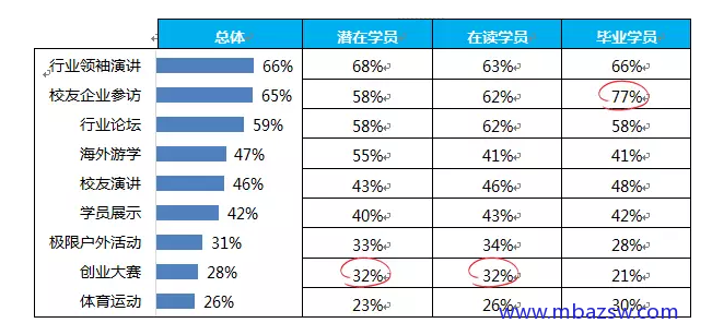 学员最感兴趣的活动是行业领袖演讲和校友企业参访;与潜在和在读学员相比,毕业学员对校友企业参访更加热衷;潜在和在读学员参与创业大赛的意愿比毕业学员更高。