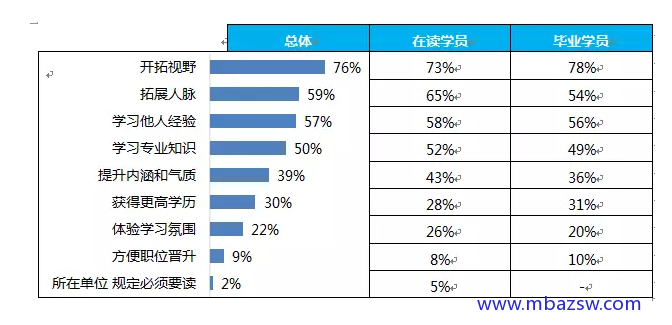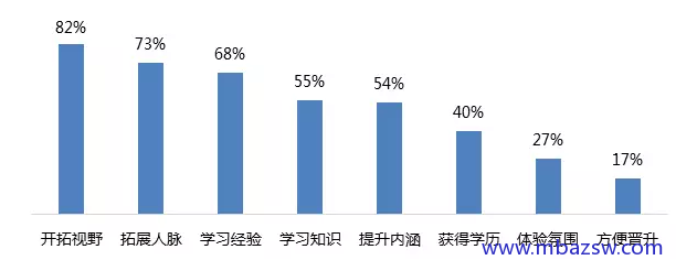 优唯通过案头研究、大数据分析、在线网络调研问卷和深度访谈,有如下发现,开拓视野、拓展人脉和学习经验和知识是学员报读EMBA的主要原因;
