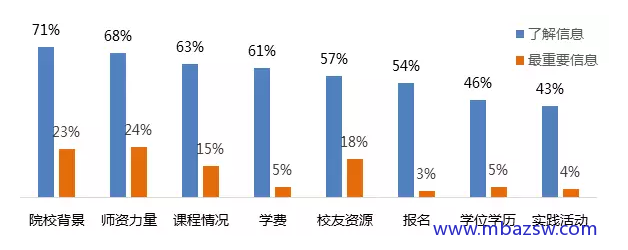学员在择校时主要会了解院校背景、师资力量、课程情况、学费、校友资源及报名流程;师资力量和院校背景是学员考量的最重要因素,其次是校友资源及课程情况。