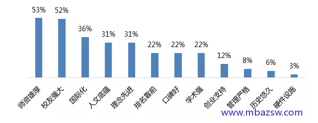 师资力量雄厚和校友资源强大被认为是理想EMBA院校最应具备的两个特点,其次是国际化程度高、人文底蕴深厚和教育理念先进。