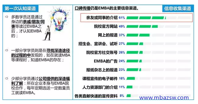 口碑,特别是来自读过EMBA校友的评价,会影响多数学员对EMBA的认知。网站和网络传播也很重要。