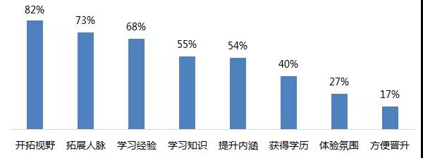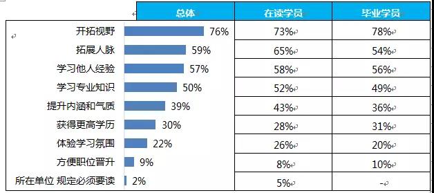 通过案头研究、大数据分析、在线网络调研问卷和深度访谈,有如下发现,开拓视野、拓展人脉和学习经验和知识是学员报读EMBA的主要原因;
