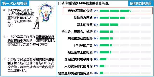 口碑,特别是来自读过EMBA校友的评价,会影响多数学员对EMBA的认知。网站和网络传播也很重要。
