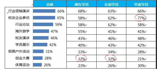 学员最感兴趣的活动是行业领袖演讲和校友企业参访;与潜在和在读学员相比,毕业学员对校友企业参访更加热衷;潜在和在读学员参与创业大赛的意愿比毕业学员更高。