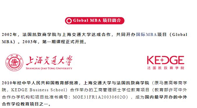 上海交通大学-法国凯致商学院Global MBA项目是EQUIS, AACSB 和 AMBA三大国际认证的在职MBA项目。自2003年以来,已经成功地举办20期,共招收学员1,300多名。