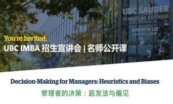 UBC IMBA即将于8月12号傍晚,举办以“管理者的决策:启发法与偏见”为题的公开课,UBC名师Dr. David Hardisty将从从心理学与经济学的视角出发,详细分析启发法的工作机制及其潜在风险,助你提高决策的正确率。David教授本科毕业于斯坦福大学,并获得哥伦比亚大学心理学博士学位,自2013年在斯坦福大学完成博士后研究,就一直在UBC教学,是UBC的顶级学者之一。