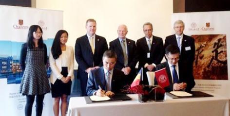 参加签约仪式的有:加拿大女王大学中国代表处专员张志尧(前排左),中国人民大学代表邱志刚教授(前右一),中国人民大学与加拿大女王大学金融硕士项目负责人、 女王大学经济学博士戴田甜(左一),加拿大女王大学在中国地区招生负责人戴安娜.张(左二), 加拿大外交部部长约翰·贝尔德(左三) 、加拿大现任总督大卫.约翰斯顿(右三),加拿大能源部部长乔·奥利弗(右二) ,以及加拿大驻华大使赵朴(右一)