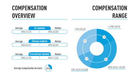 2018年收入平均值为52.4万元,入学前后薪资增幅平均值为37%。其中,中国籍学生毕业年收入平均值为48.4万元,外籍学生为64.3万元。
