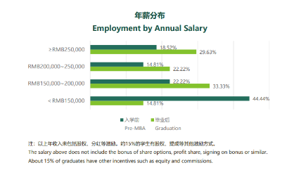 中财MBA与入学前相比,整体年薪层次普遍提高,增幅显著,平均年薪30.36万元,比入学时提高了57.55%;最高年薪220万元。