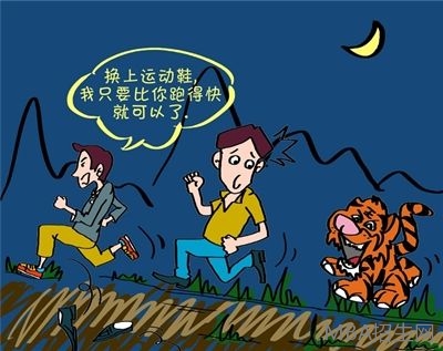 两个人在森林里,遇到了一只大老虎。A赶紧从背后取下一双更轻便的运动鞋换上。B急死了,骂道:“你干嘛呢,再换鞋也跑不过老虎啊!”A说:“我只要跑得比你快就好了。”