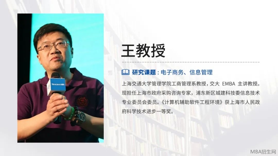 王博士,上海交通大学管理学院副教授,上海交大管理学院EMBA主讲教授。国内电子商务与信息化管理的技术型与管理型双重专家。上海交通大学管理学院EMBA学员最受欢迎讲师之一,现担任上海市政府采购咨询专家,徐汇区人民政府专家顾问委员会委员,浦东新区城建科技委信息技术专业委员会委员。善于将复杂枯燥的信息技术与信息管理内容深入浅出,讲课风趣,注重应用,著有《电子商务-管理新视角》。
