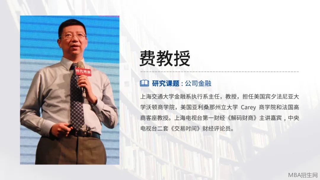 上海交通大学安泰经济与管理学院EMBA课程教授,金融系副教授,创新创业EMBA项目创业导师,2006-2009年曾任上海交通大学安泰经济与管理学院金融系执行副系主任。主要专业领域为公司金融。学术经历: