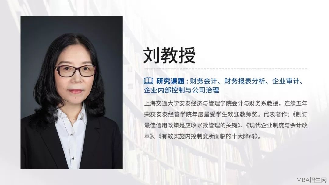 上海交通大学安泰经济与管理学院EMBA和EDP课程教授,兼任多家大中型企业的公司财务顾问及独立董事。 长期执教EMBA,EDP《财务会计与决策》、《财务报表分析》和《决策中财务管理》等课程,并连续多年获得了上海交通大学安泰经济与管理学院最受欢迎的MBA课程教授、最受欢迎的会计报表分析课程教授。