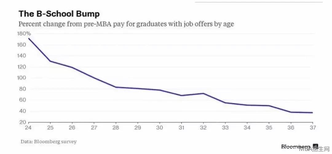 从上图可以得出,随着年龄的增长MBA毕业生薪水的增幅也在下降。图中还能看出36岁和25岁的MBA毕业生的薪水比入学前分别能够增长约47%和130%。