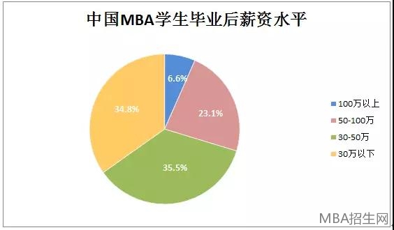 据不完全统计,中国MBA学生毕业后有6.6%的人年薪在100万以上,23.1%的人年薪50万到100万,35.5%的人年薪在30万到50万,余下的34.8%的人年薪在30万以下。近些年,受市场的影响,中国MBA毕业生涨幅高于欧美。