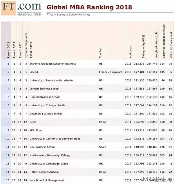 1月29日,英国《金融时报》( Financial Times )发布“全球MBA百强榜”( Global MBA Ranking 2018 ),斯坦福商学院、INSEAD、沃顿商学院摘得前三甲。 进入排行榜的中国学校共有7所,分别为今中欧国际工商学院、香港科技大学商学院、香港大学、上海交通大学安泰经管学院、复旦大学管理学院、中国人民大学商学院、香港中文大学商学院。