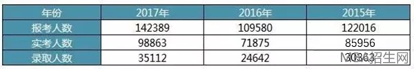 从近三年招录人数分析,报考人数大致以2万左右递增,实考人数紧跟上升,录取人数稳定在3万人上下浮动。从长远数据看,每隔2-3年录取人数会有一次跃升。从报考趋势可以看出,报考人数逐年上涨,MBA等管理类联考报考项目热度不减。